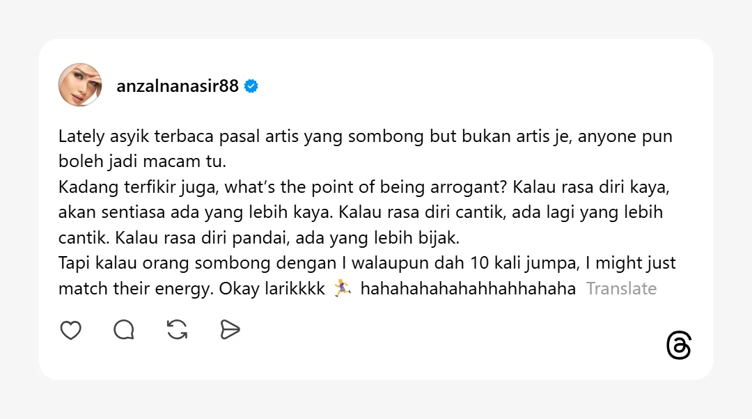 Anzalna Nasir menerusi hantaran di Thread, turut mempersoalkan keperluan individu terlibat untuk bersikap sombong, selain menjelaskan bahawa dia akan bersikap sombong jika individu terlibat memberikan layanan yang sama.