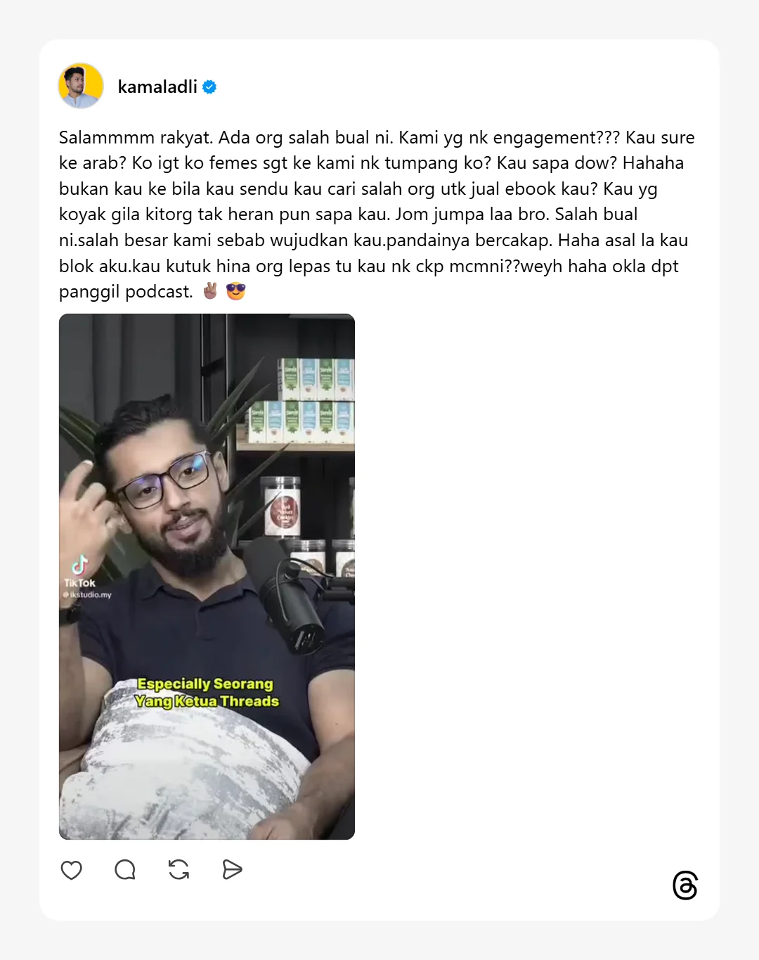 Kau yang koyak gila kiteorang tak heran pun siapa kau. Jom jumpa la bro. Salah bual ni. Salah besar kami sebab wujudkan kau. Pandainya bercakap. Haha asal kau block aku, Kau kutuk hina orang lepas tu kau nak cakap macam ni? Weyh haha okay la dapat panggil podcast.”-tulis Kamal Adli di Threads