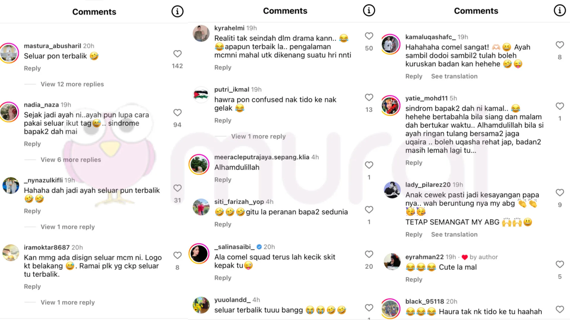 Menjengah ruangan komen, rata-rata netizen meluahkan rasa terhibur melihat gelagat Kamal yang kini memulakan rutin sebagai bapa dengan mendodoikan bayi perempuannya itu, malah ramai yang ‘menegur’ Kamal sudah mengalami sindrom ‘bapa-bapa’ apabila dikatakan memakai seluar terbalik.