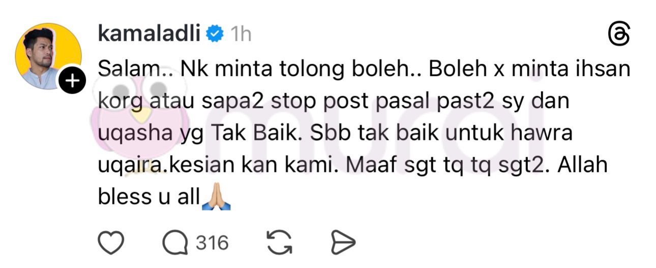 Sebab tak baik untuk Hawra Uqaira. Kesian kan kami. Maaf sangat, terima kasih sangat-sangat. Allah bless you all.”-tulis Kamal di Thread