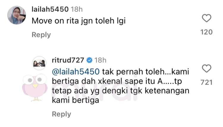 Dalam pada itu, Rita turut membalas salah satu komen netizen, dengan menyatakan bahawa dia dan anak-anak sudah tidak mengenali siapakah gerangan si ‘A’ itu.