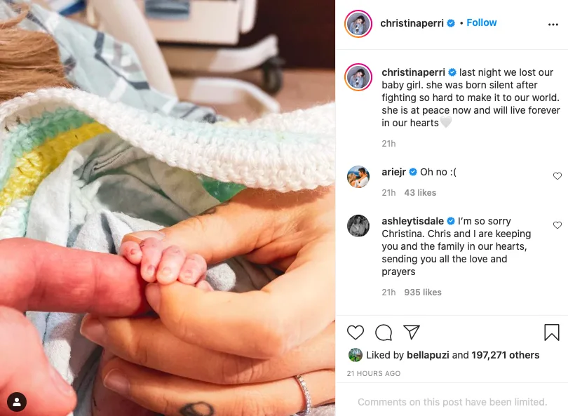 Penyanyi Hollywood terkenal Christina Perri menerusi hantaran di laman Instagram berkongsi khabar sedih yang mana bayi perempuannya telah meninggal dunia.