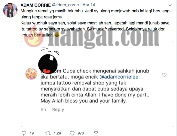 Terdahulu, Adam turut pernah dipersoalkan mengenai soalan yang sama, tanpa rasa segan silu dan penat, dia mengaku bahawa badannya masih penuh dengan tatu. Namun begitu, ianya bukanlah bermaksud bahawa solat dan kebersihan dirinya tidak terjaga, jawabnya di Twitter miliknya.
