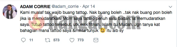 Jawabnya sambil berseloroh, dia turut meminta pada netizen untuk tidak bertanyakan di bahagian manakah tatu tersebut berada kerana ianya sebahagian daripada aibnya. Ada- ada sahaja netizen ini bukan? Kasihan pada mereka yang bergelar saudara baru ini. Islam itu bukankah mudah? Renung-renungkan!