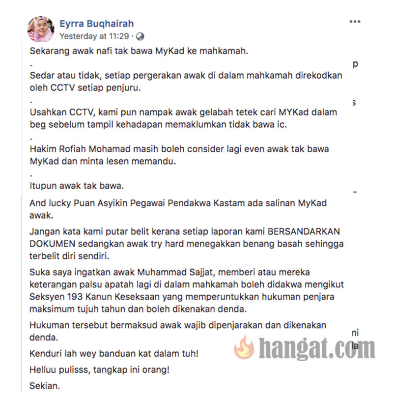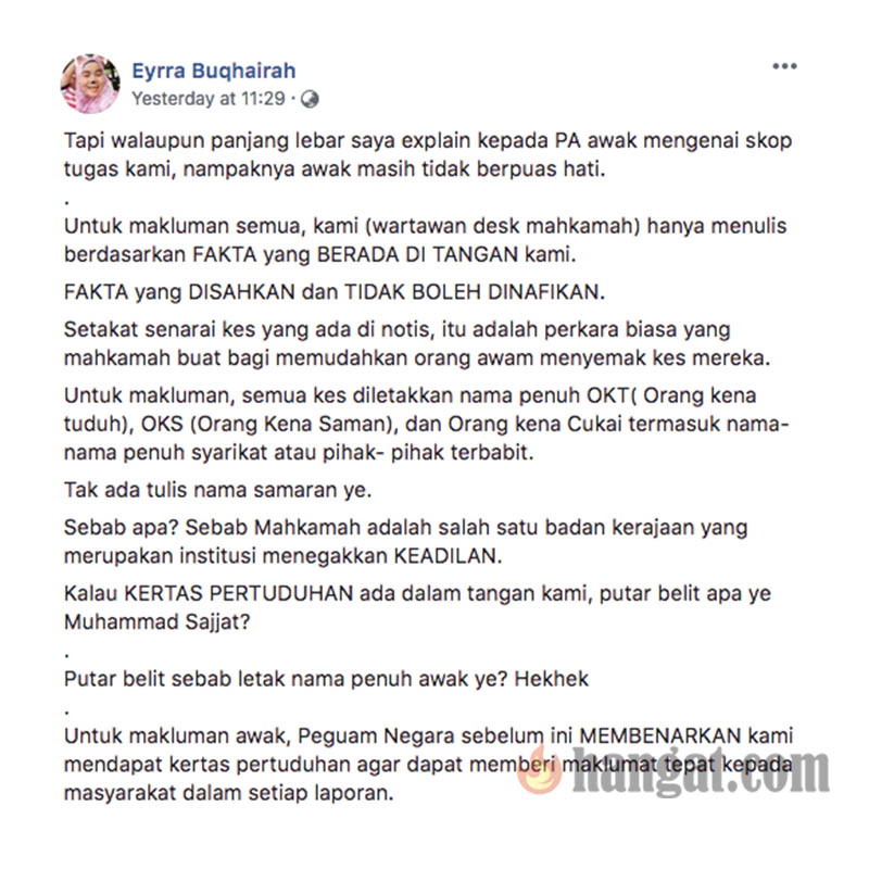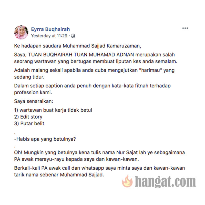 Eyrra dalam keterangannya, menolak dakwaan Nur Sajat menuduh wartawan putar belit dan menyampaikan informasi yang tidak benar. Lihat penjelasan penuh Eyrra di bawah.