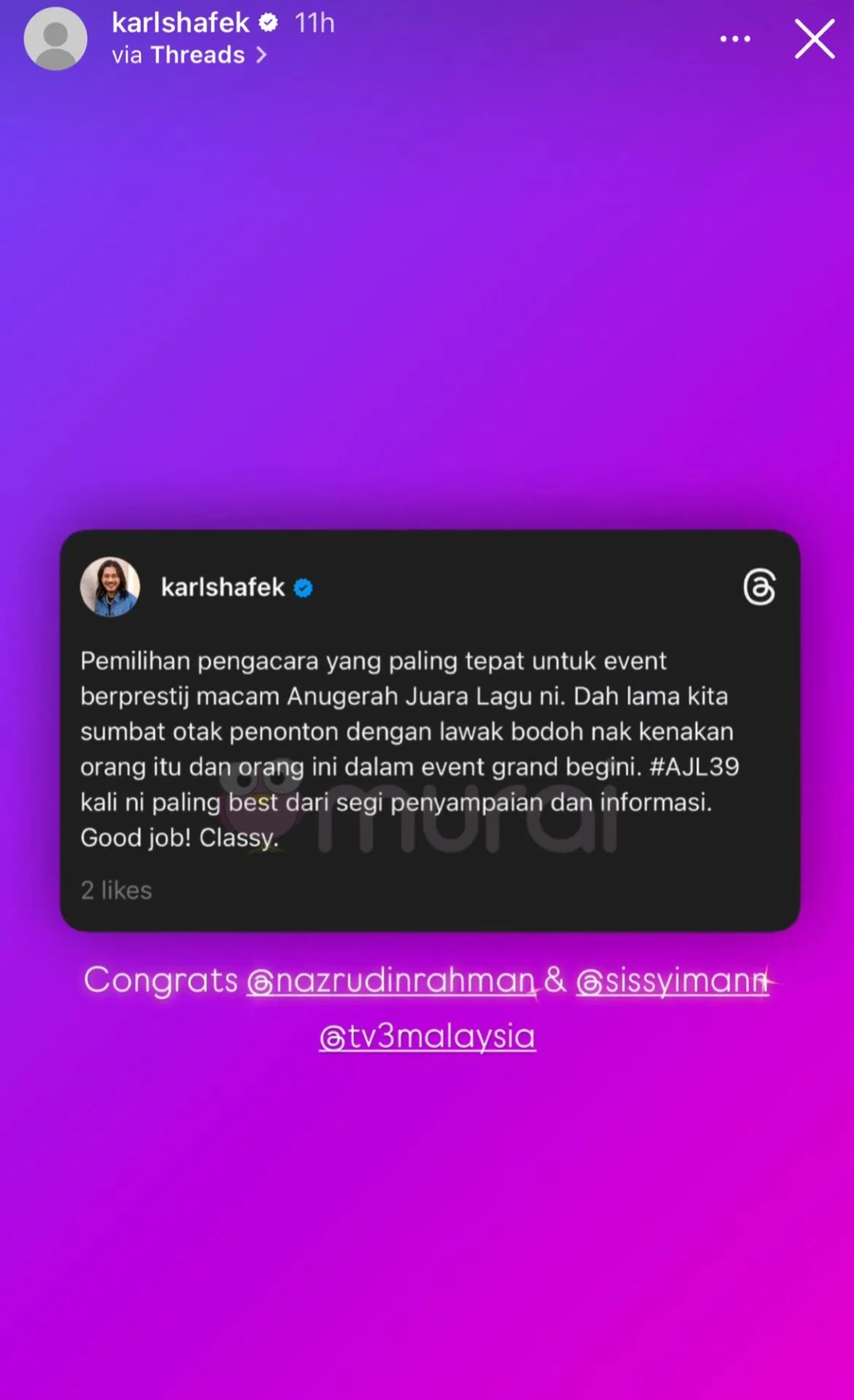 Karl Shafek, menerusi hantaran di laman X, menyifatkan pemilihan pengacara kali ini paling tepat untuk acara berprestij seperti AJL.