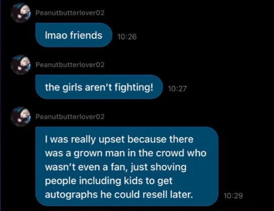 Melalui mesej Weverse, Manon menjelaskan bahawa emosinya ketika itu tercetus akibat tindakan seorang lelaki dewasa di bahagian penonton. Individu tersebut dikatakan menolak peminat lain, termasuk kanak-kanak demi mendapatkan autograf supaya dapat dijual semula.