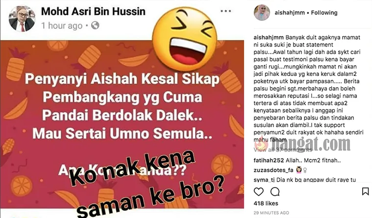 Juara Gegar Vaganza musim keempat (GV4), Aishah bengang apabila mengetahui ada Individu yang menggunakan namanya menfitnah demi kepentingan politik.