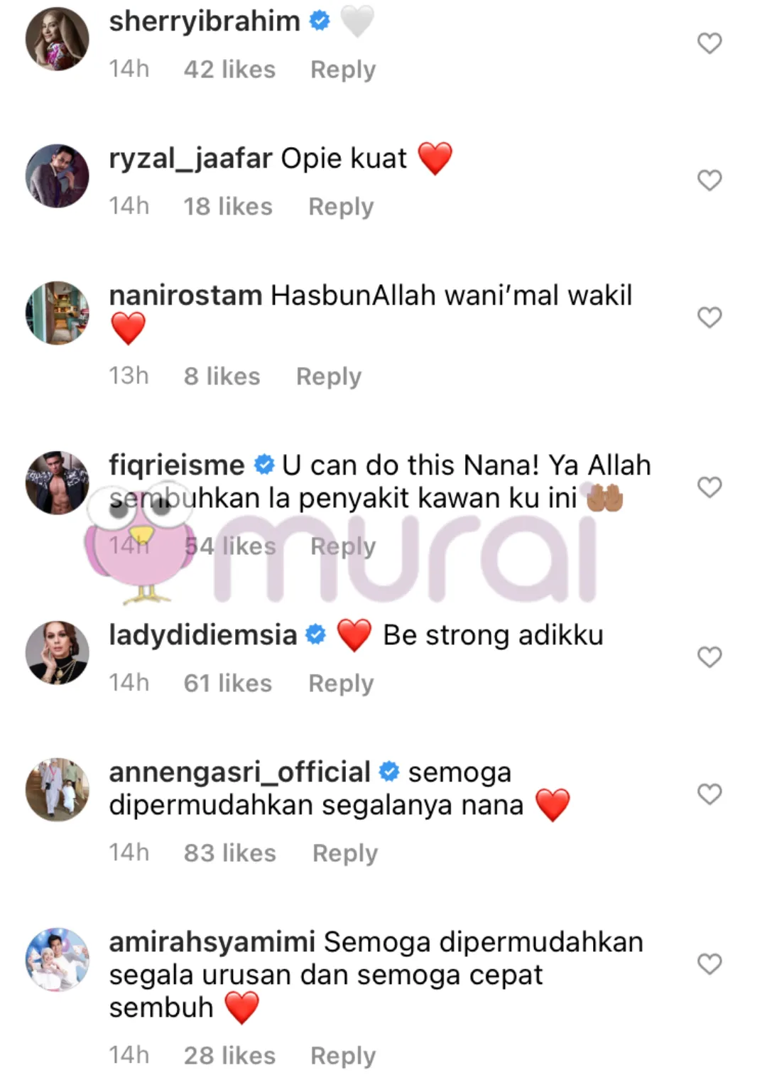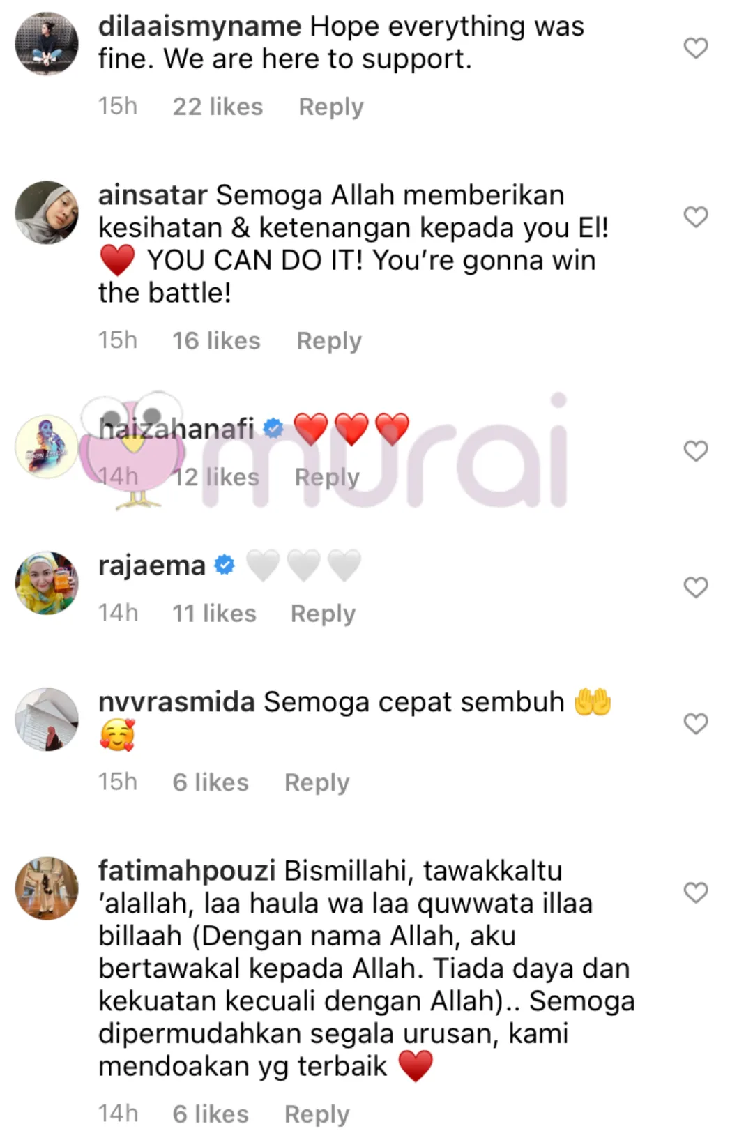 Menerusi ruangan komen hantaran Elyana, rata-rata rakan selebriti dan peminat mendoakan agar penyanyi ini diberikan kesembuhan.