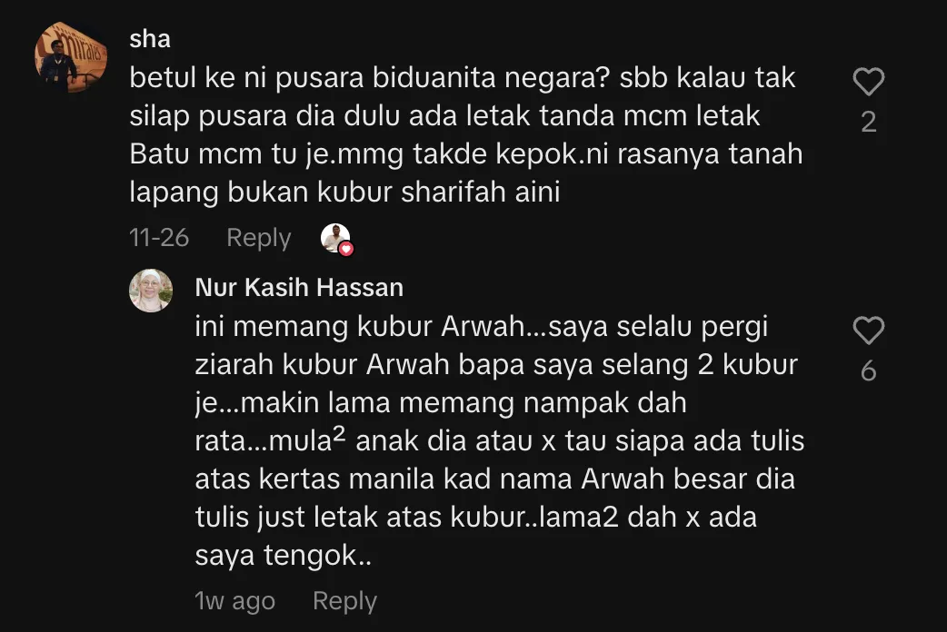 “Ini memang kubur Arwah… saya selalu pergi ziarah kubur Arwah bapa saya selang 2 kubur je… makin lama memang nampak dah rata… mula-mula anak dia atau tak tahu siapa ada tulis atas kertas manila kad nama Arwah besar dia tulis, just letak atas kubur… lama-lama dah tak ada saya tengok…”