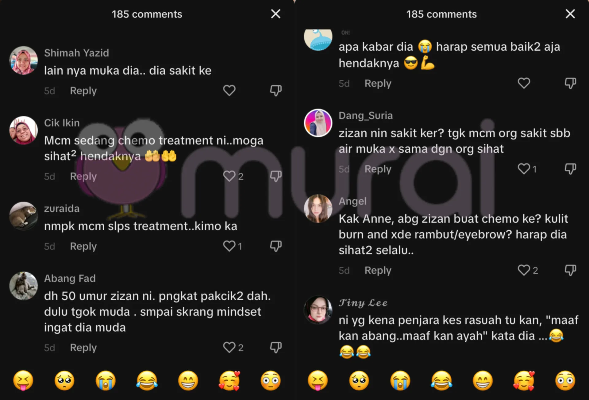 Menjengah ke ruangan komen, rata-rata netizen dilihat meluahkan rasa terkejut melihat keadaan terkini Zizan yang sangat berbeza, malah ada yang berpendapat pelakon ini menjalani rawatan kemoterapi disebabkan warna kulitnya yang kelihatan ‘terbakar’ serta rambut botak dan tiada kening.