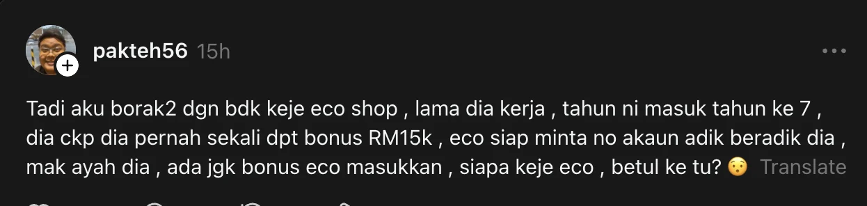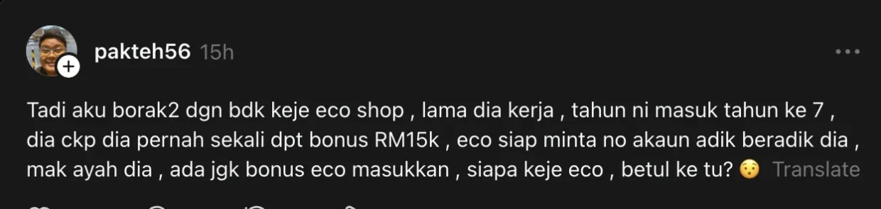 “Tadi aku borak-borak dengan budak kerja Eco Shop, dia cakap dia pernah sekali dapat bonus RM15k, Eco siap minta no akaun adik beradik dia, mak ayah dia…”