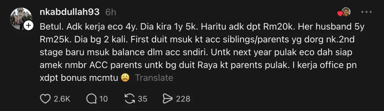 “Betul. Adik kerja Eco 4 tahun. Dia kira 1 tahun RM5k. Haritu adik dapat RM20k. Suami dia 5 tahun dapat RM25k… first duit masuk akaun parents/siblings dulu, lepas tu baru balance masuk akaun sendiri.”