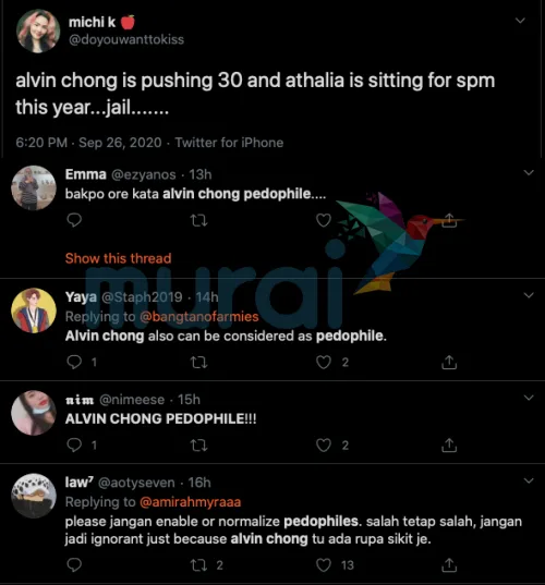 Di media sosial hangat memperkatakan mengenai pelakon dan penyanyi Alvin Chong yang kononnya sedang hangat bercinta dengan seorang remaja perempuan di bawah umur yang juga personaliti media sosial, Athalia.
