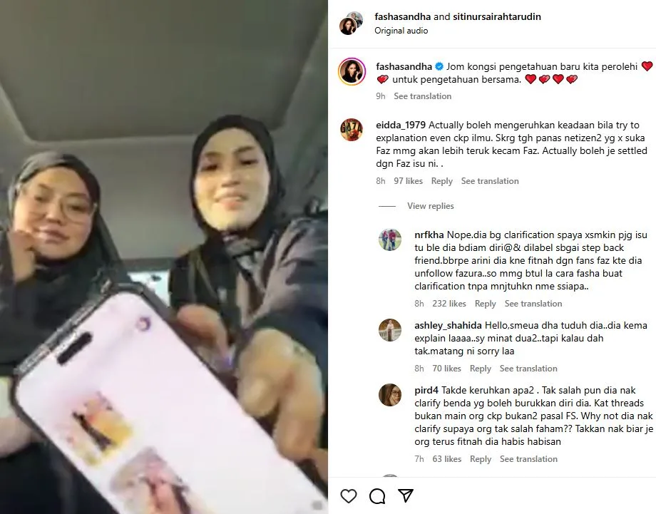 Enggan keadaan terus menjadi teka-teki, Fasha akhirnya tampil menjelaskan hal sebenar. Menerusi siaran langsung di Instagram bersama rakannya, Siti Saerah.