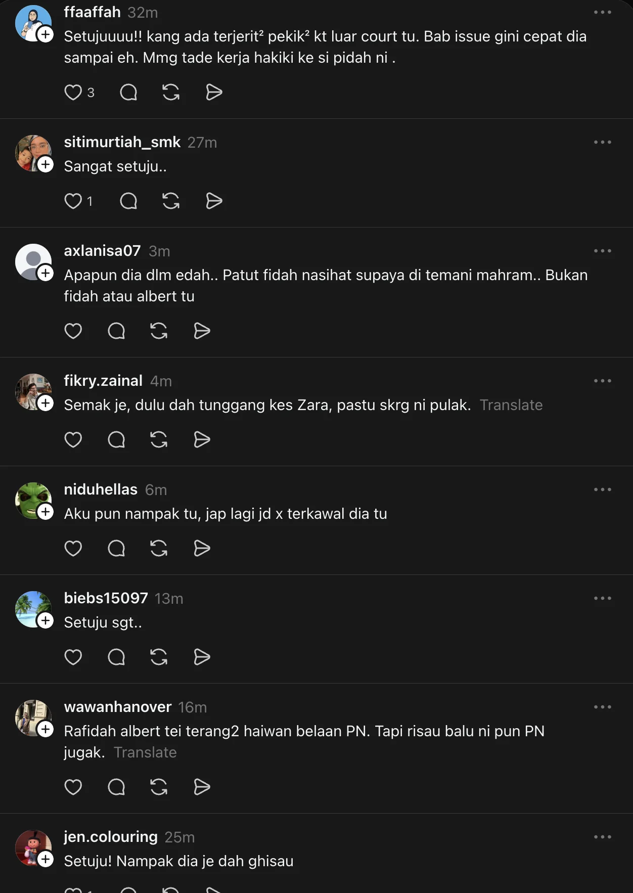 “Saya harap sangat balu Almarhum Amirul Hafiz tu jauhkan diri dari Rafidah Ibrahim sebab dia hadir untuk menunggang isu bagi kepentingan sendiri. Kita tak nak simpati kepada keluarga akan jadi menyampah sebab wujudnya makhluk tak tahu malu seperti Rafidah,” tulis seorang pengguna Threads, mencetuskan perdebatan hangat.