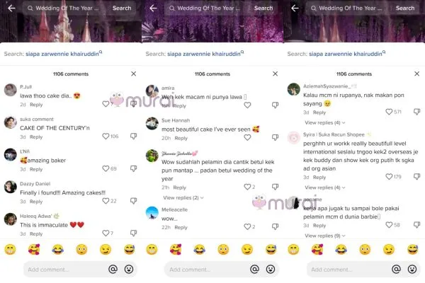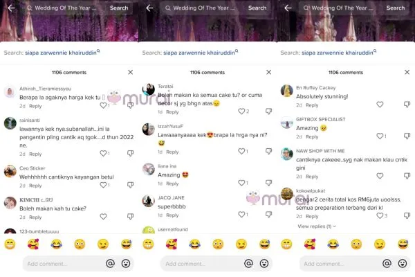 Murai menjengah ke ruangan komen muatnaik tersebut dan mendapati rata-rata ramai warganet tertanya-tanya tentang harga kek tersebut dan ada juga yang berkongsi pelbagai pandangan tentang kek pengantin berkenaan.