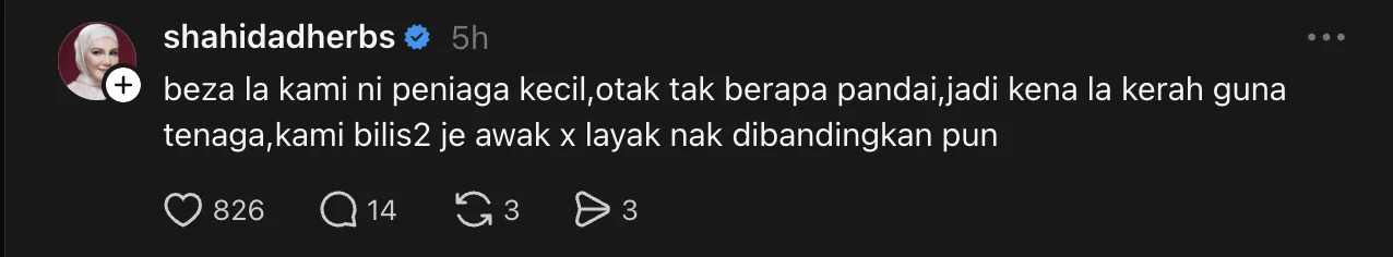 “Beza la kami ni peniaga kecil, otak tak berapa pandai, jadi kena la kerah guna tenaga. Kami bilis-bilis je awak, tak layak nak dibandingkan pun,” tulis Shahida.