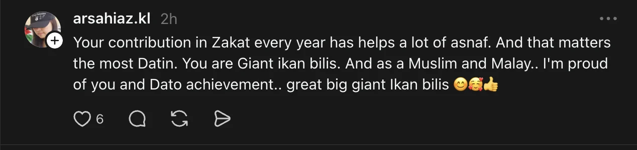 “Your contribution in zakat every year has helped a lot of asnaf. And that matters the most Datin. You are giant ikan bilis. And as a Muslim and Malay, I’m proud of you and Dato achievement… great big giant ikan bilis,” tulis seorang pengguna.