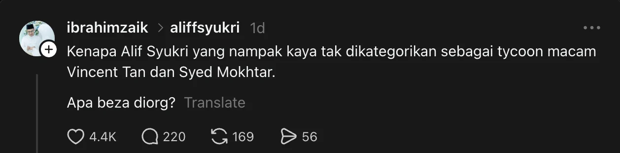“Kenapa Alif Syukri yang nampak kaya tak dikategorikan sebagai tycoon macam Vincent Tan dan Syed Mokhtar. Apa beza diorang?” tulis netizen berkenaan.