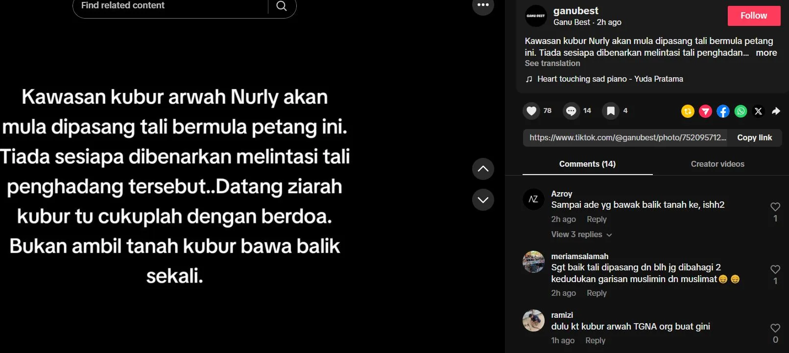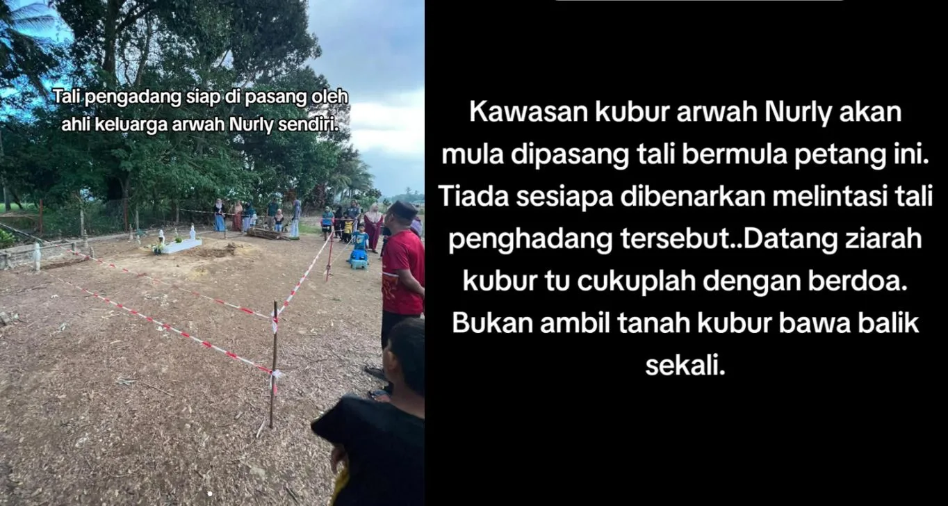 Malah dalam perkongsian tersebut juga, Ganu Best menerangkan bahawa demi mengelakkan kejadian tidak diingini berulang, keluarga arwah telah bertindak memasang tali penghadang di sekeliling kubur Allahyarhamah pada petang Sabtu lalu.