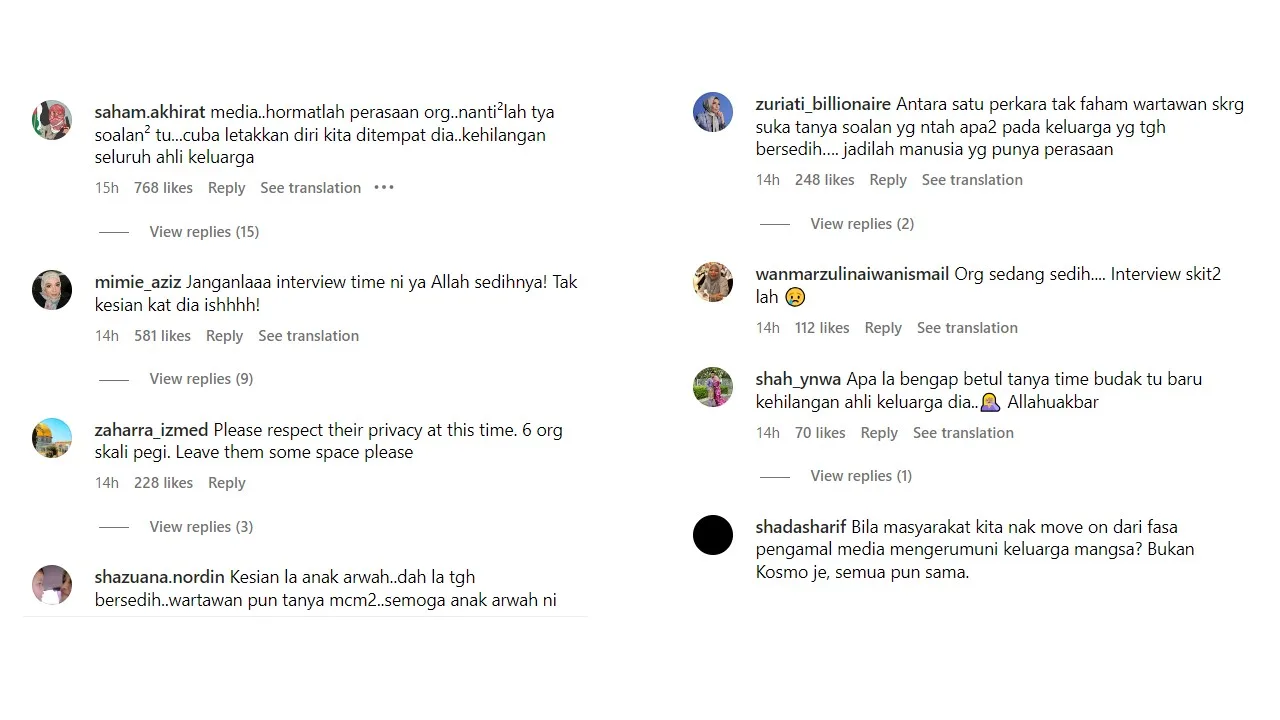 Malah ada juga netizen yang memberikan nasihat dan meminta supaya pihak tersebut untuk menghormati dan memberi ruang kepada anak mangsa kemalangan tersebut untuk lebih tenang sebelum ditemubual sedemikian cara.