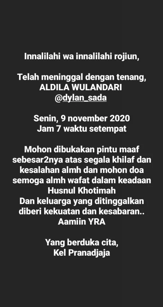 “Mohon buka pintu untuk meminta maaf atas semua kesalahan dan kesalahan si mati dan minta doa agar si mati meninggal dalam keadaan husnul khotimah. Dan keluarga yang ditinggalkan diberi kekuatan dan kesabaran. Amin YRA. ” tulisnya.