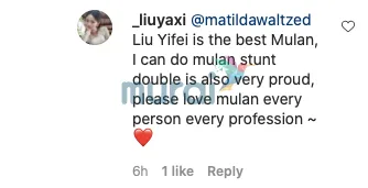 Meskipun Yifei melakukan hampir 90% aksi lagak ngeri dalam Mulan,namun media antarabangsa melaporkan Yaxi melakonkan lebihan 10% aksi yang lebih merbahaya.
