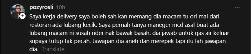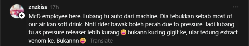 Meninjau ruangan komen, terdapat beberapa komen oleh bekas pekerja restoran makanan segera yang mengatakan mesin “seal” minuman sememangnya akan menghasilkan dua lubang kecil secara automatik pada bahagian atas penutup, khususnya untuk minuman berkarbonat.