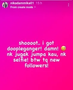 “shoooot.. i got doopleganger! Damn! nk jugak jumpa kau,nak selfie! btw tq new followers!”- tulisnya di IG Stories
