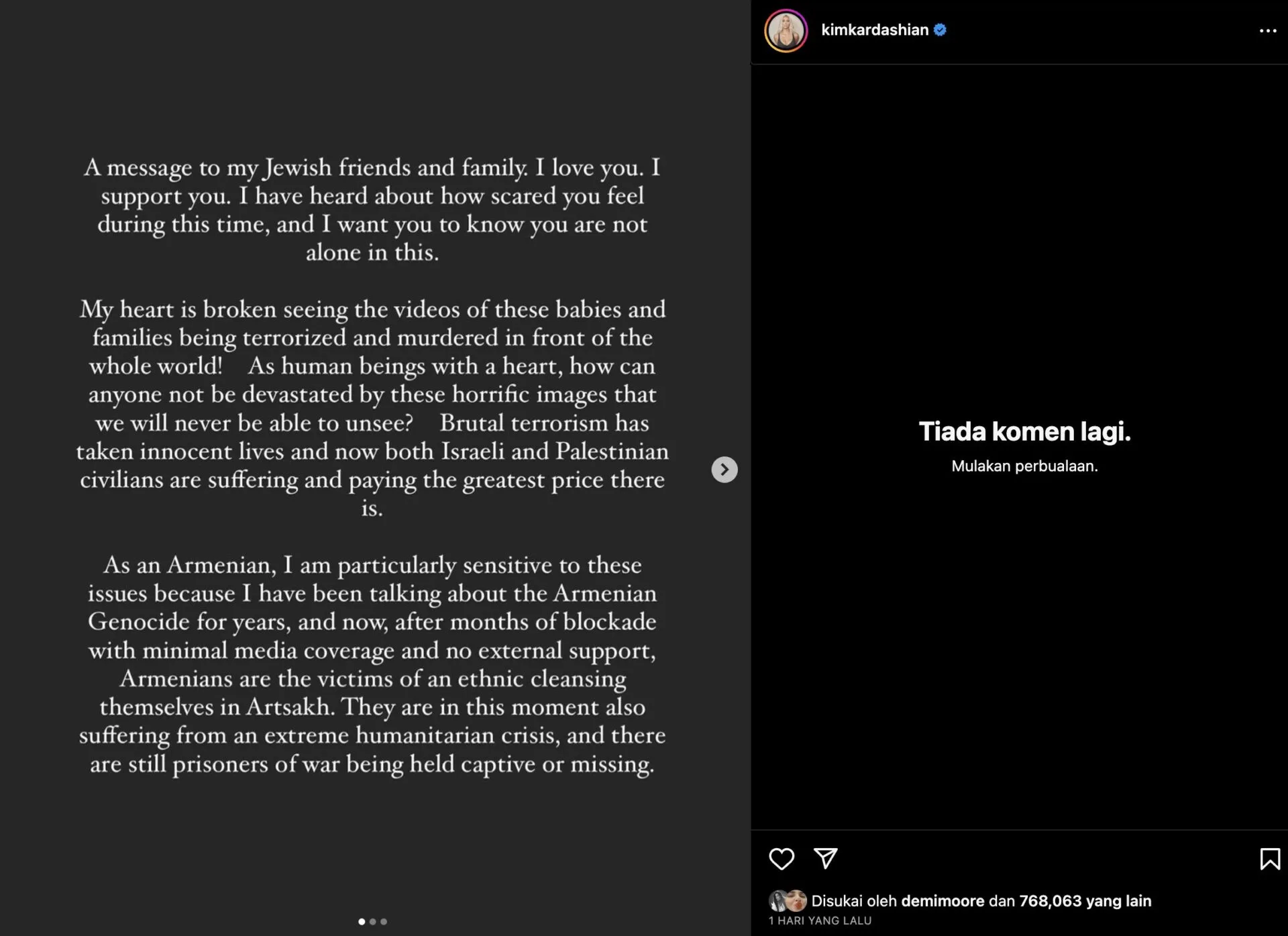 Walaupun sejarah antara Israel dan Palestin kekal begitu, Kardashian, 42, berkata “keganasan kejam” yang berlaku di luar negara menyebabkan “penderitaan” di kedua-dua belah pihak kerana rakyat membayar “harga paling tinggi” untuk perang yang berterusan.