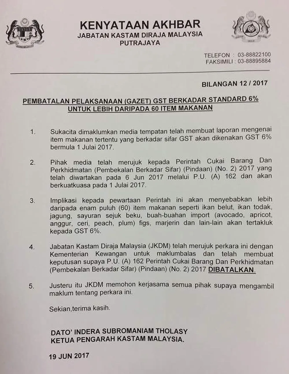 Susulan daripada satu perintah yang dikeluarkan menerusi portal rasmi dari Jabatan Kastam Malaysia, atau GST memaklumkan bahawa 60 jenis makanan dikenakan cukai, kerajaan hari ini membatalkan hasrat tersebut, menurut Jabatan Kastam Diraja Malaysia.
