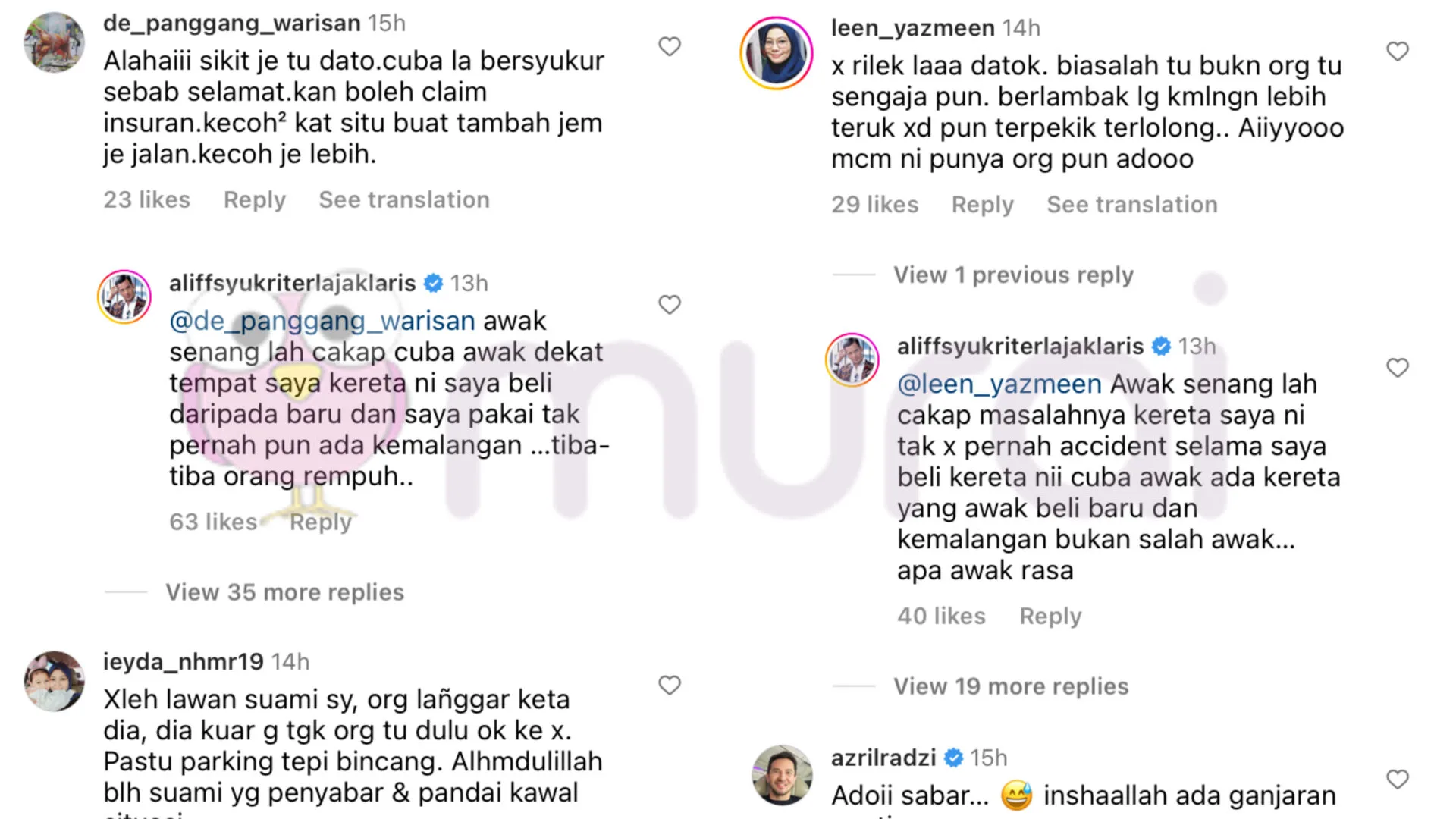 Tidak berdiam diri, Aliff dilihat membidas beberapa komen netizen yang dikatakan “senang cakap”, walhal kenderaan yang dibelinya tidak pernah mengalami sebarang kemalangan tiba-tiba mengalami rempuhan.