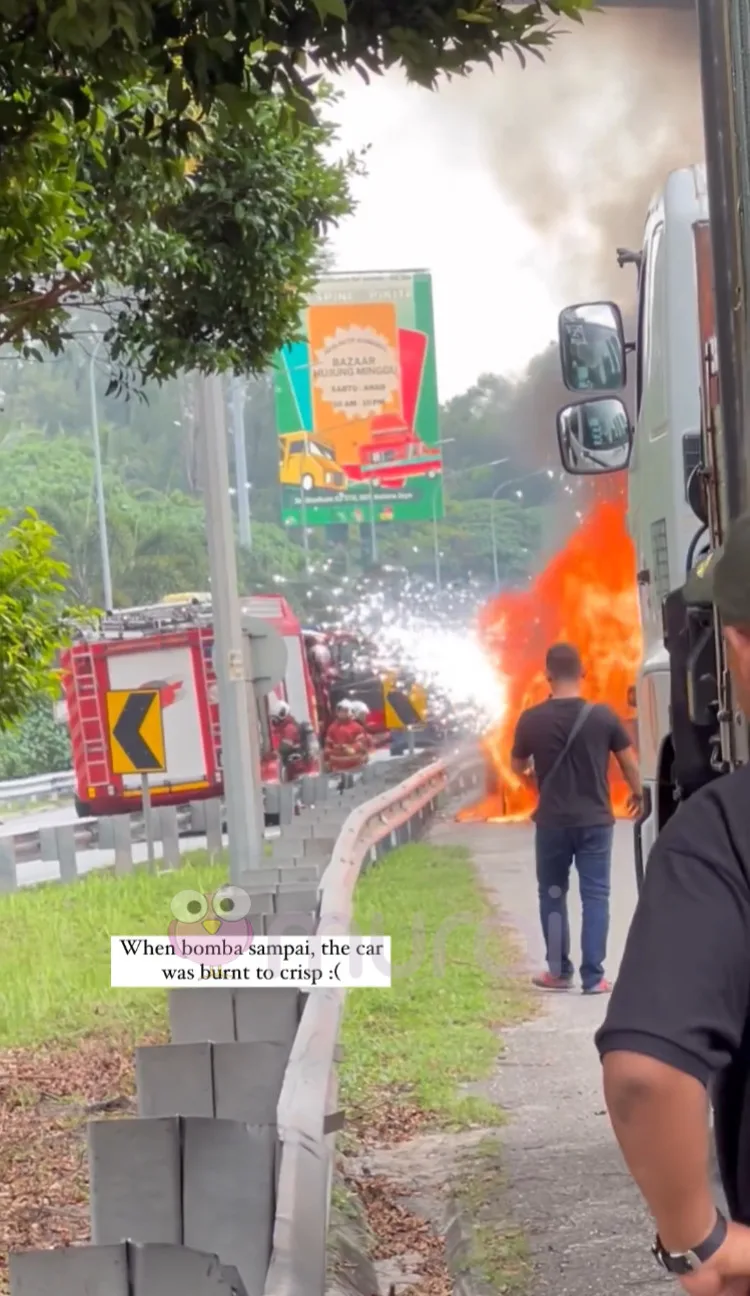 Akui panik dengan insiden yang berlaku, Erysha meluahkan rasa sedih melihat kenderaan kesayangannya yang hangus sejurus pihak bomba tiba untuk memadamkan kebakaran.