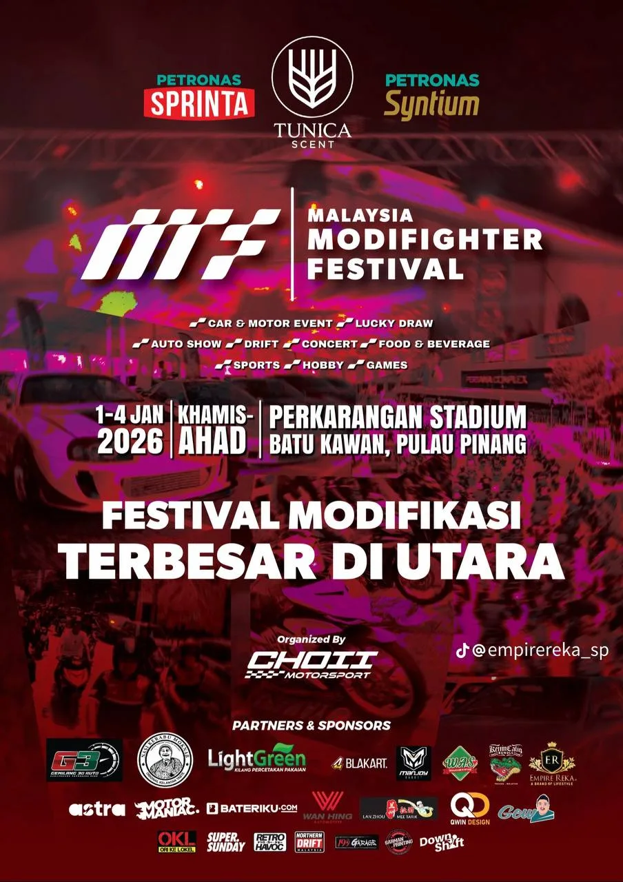 Acara gergasi Malaysia Modifier Festival bakal berlangsung dari 1 hingga 4 Januari 2026 bertempat di Perkarangan Stadium, Batu Kawan, Pulau Pinang dengan penyertaan nama-nama besar dari Johor, Kuala Lumpur dan seluruh Malaysia malah peminat modifikasi akan disajikan dengan auto show, drift, konsert, serta pelbagai lagi aktiviti menarik