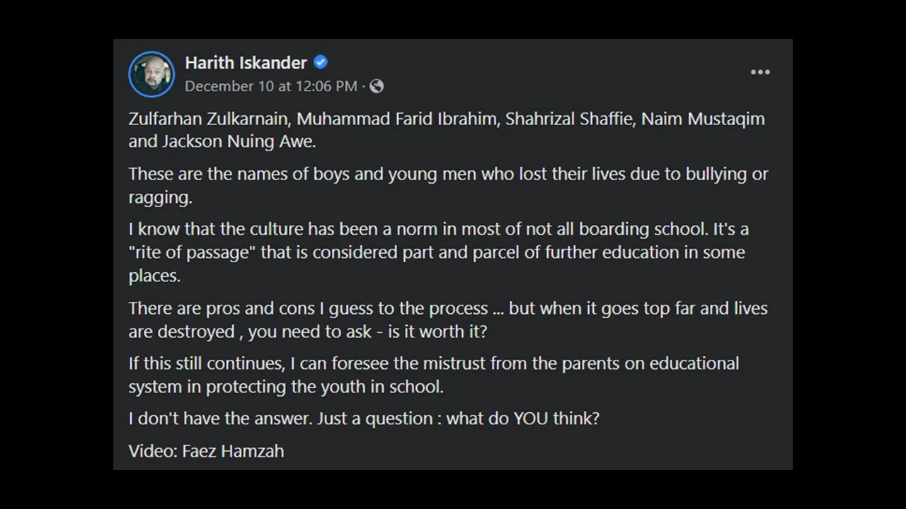 Kejadian buli tersebut telah mendapat perhatian dari Harith Iskander. Dalam perkongsiannya di Facebook, Harith mengimbau kembali nama nama yang pernah menjadi mangsa buli sehingga kehilangan nyawa.
