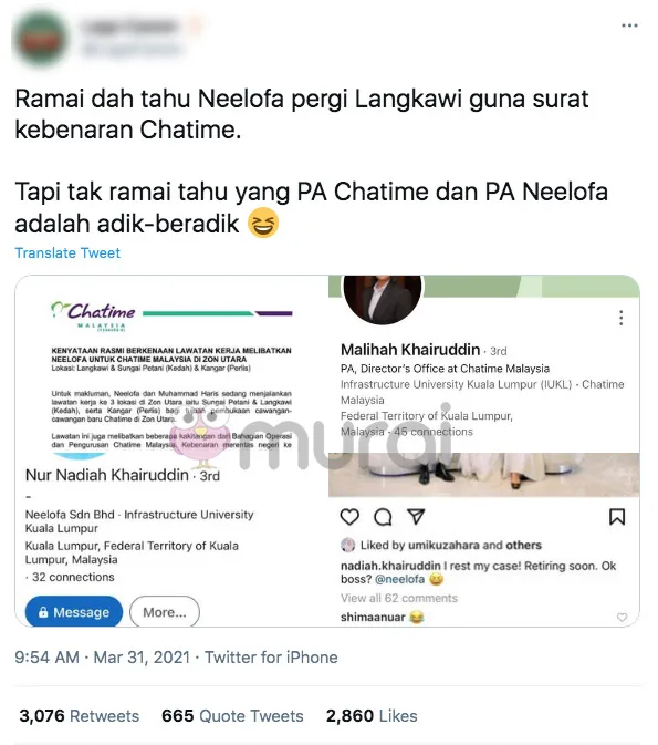 Di laman media sosial, sebuah akaun twitter telah menyiasat dan mendedahkan bahawa pembantu peribadi Neelofa dan Chatime merupakan pasangan adik beradik. Hal ini telah disedari setelah melihat nama bapa kedua-dua pembantu peribadi ini adalah sama.