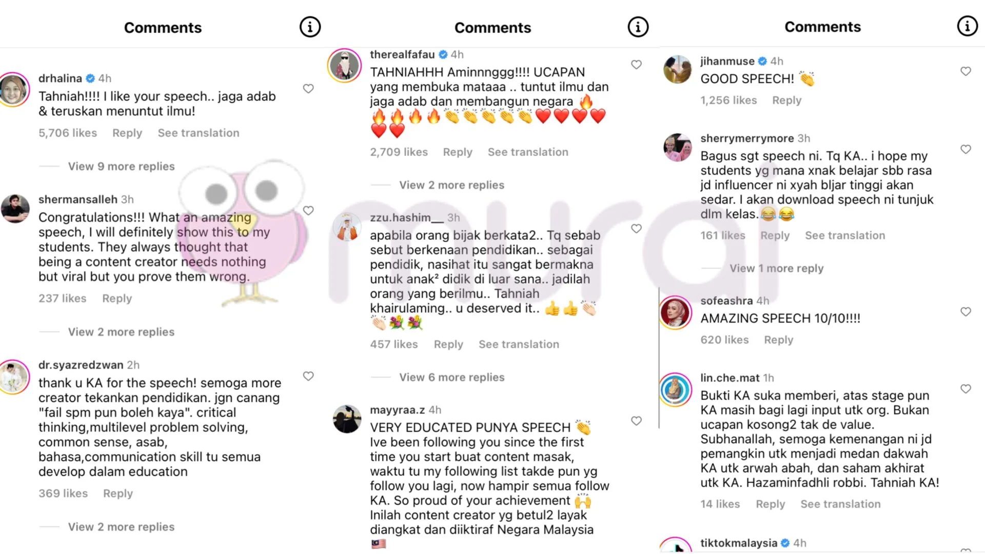 “Bagus sangat speech ni. Tq KA. Saya harap pelajar-pelajar saya yang mana taknak belajar sebab rasa nak jadi influencer ni akan sedar. Saya akan download speech ni tunjuk dalam kelas.”
