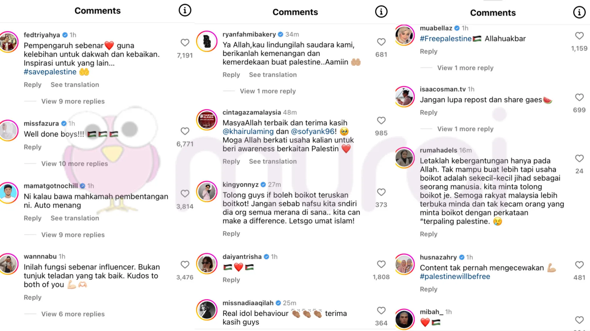 “MasyaAllah terbaik dan terima kasih Khairul Aming dan Sofyank!. Moga Allah berkati usaha kalian untuk beri awareness berkaitan Palestin.”-Cinta Gaza Malaysia