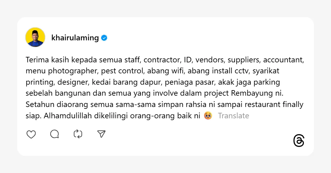 Terkini, Khairul Aming menerusi hantaran di Thread, turut menitipkan ucapan buat semua pihak termasuklah staf, kontraktor, dan ramai lagi yang terlibat telah menyimpan rahsia mengenai projek restorannya sehingga siap selain merasa bersyukur apabila dikelilingi orang-orang yang baik.