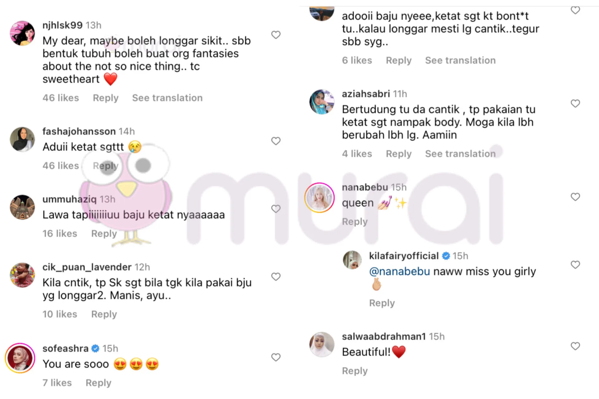 “Bertudung tu dah cantik, tapi pakaian tu ketat sangat nampak body. Moga Kila lebih berubah. Aamin.”