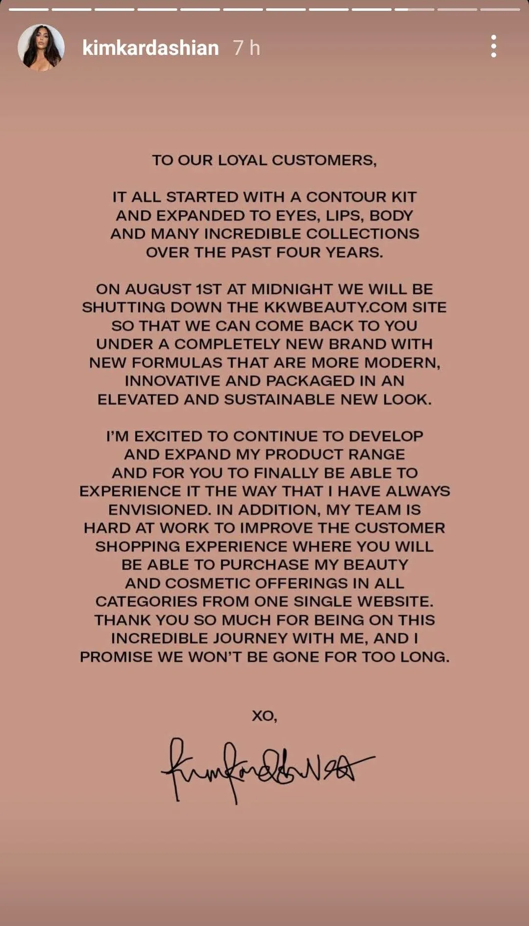 “Pada 1 Ogos tengah malam, kami akan menutup laman KKWBeauty.com supaya kami dapat kembali kepada anda di bawah jenama yang baru dengan formula baru yang lebih moden, inovatif, dan penampilan baru yang lebih tinggi dan lestari.”-Kim Kardashian