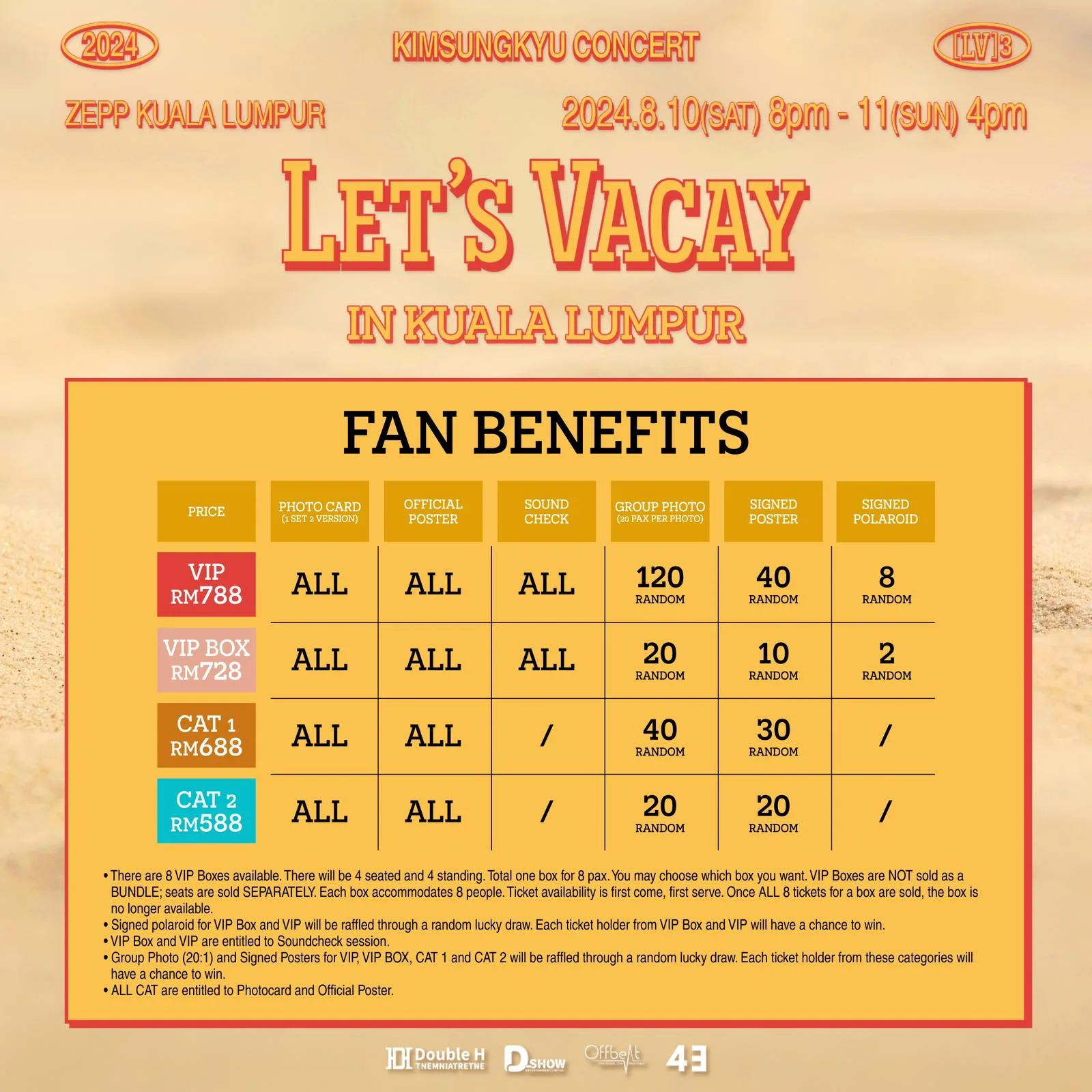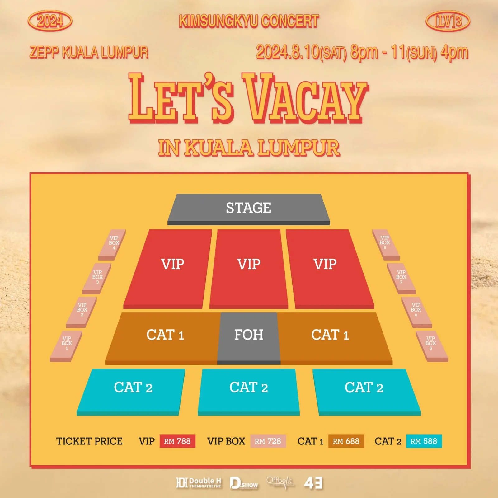 Untuk maklumat lanjut dan terkini tentang konsert Kim Sung Kyu 2024 [LV3: Let’s Vacay] Asia Tour di Kuala Lumpur untuk dua malam itu, sila dapatkan maklumat di platform media sosial rasmi. Promoter FB: 43 & Promoter IG: 43 .