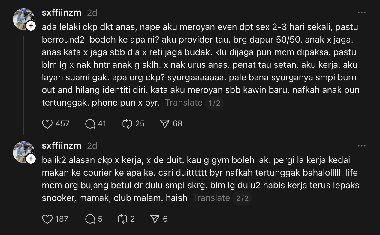 “Ada lelaki cakap dekat Anas, ‘nape aku meroyan even dapat sex 2-3 hari sekali, pastu berround2. Bodoh ke apa ni? Aku provider tau. Barang dapur 50/50. Anak tak jaga. Anas kata tak jaga sebab dia tak reti jaga budak. Kalau dijaga pun macam dipaksa. Pastu belum lagi tak nak hantar anak pergi sekolah. Tak nak urus Anas. Penat tau setan. Aku kerja, aku layan suami juga. Apa orang cakap? Syurgaaaaaaa. Paling bahaya syurganya sampai burn out dan hilang identiti diri. Kata aku meroyan sebab kawin baru. Nafkah anak pun tertunggak. Phone pun tak bayar.”