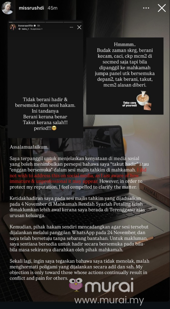 Dia bukan sengaja tidak hadir ke mahkamah, sebaliknya sudah memaklumkan awal bahawa dirinya berada di Terengganu. Pihak hakam sendiri mencadangkan agar sesi dilakukan melalui panggilan WhatsApp, memandangkan jarak dan komitmen. Dia juga menegaskan tidak pernah menolak poligami, sekali gus menolak tuduhan yang dilemparkan terhadapnya.
