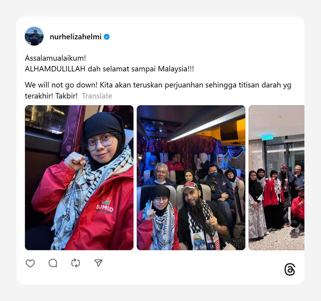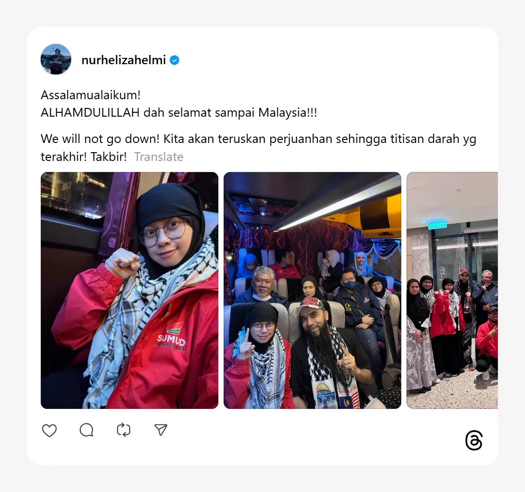 “Assalamualaikum! Alhamdulillah dah selamat sampai Malaysia!!. Kami tidak akan berundur! Kita akan teruskan perjuangan sehingga titisan darah yang terakhir! Takbir!.”-kongsi Heliza di Thread