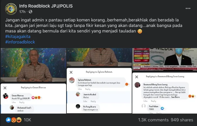 Halaman Facebook Info Roadblock JPJ / POLIS nampaknya telah mendedahkan beberapa nama akaun Facebook yang dianggap biadab. Mereka dilihat meninggalkan komen yang benar-benar melanggar undang-undang. Kata-kata mereka seolah-olah tidak sensitif dan menghina.