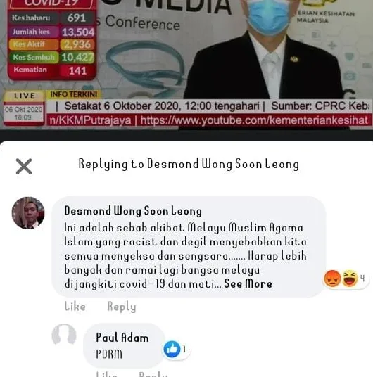Salah satu komen dijumpai semasa kemas kini situasi Covid-19 Ketua Pengarah Kesihatan Malaysia, Tan Sri Dr Noor Hisham Abdullah semalam, 6 Oktober.