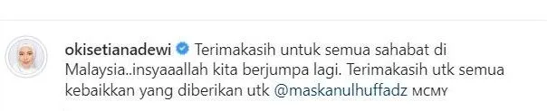 “Terima kasih untuk semua sahabat di Malaysia..insyaaallah kita berjumpa lagi. Terima kasih utk semua kebaikkan yang diberikan utk @maskanulhuffadz “- tulis Oki di postingnya
