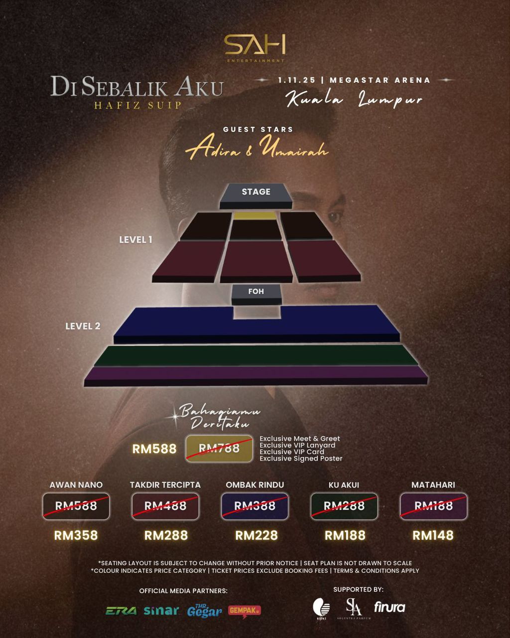 Harga tiket baharu konsert diumumkan seperti berikut: RM788 diturunkan kepada RM588, RM588 (RM358), RM488 (RM288), RM388 (RM228), RM288 (RM188) dan RM188 (RM148).